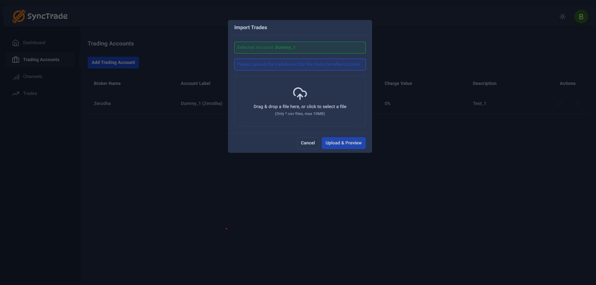 You'll see a drag-and-drop interface. Simply drag your tradebook.csv file here or click to select it from your computer. SyncTrade immediately validates the file format to ensure it's a valid Zerodha Tradebook.